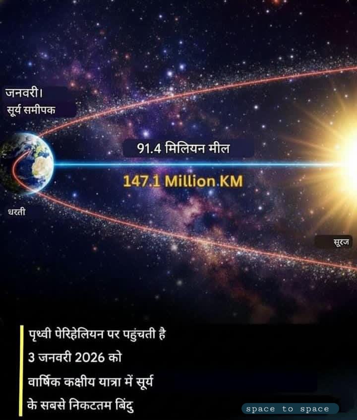 इस दिन पृथ्वी अपनी कक्षा (orbit) में सूर्य के सबसे निकटतम बिंदु पर होगी। खगोलीय गणनाओं के अनुसार, यह घटना भारतीय समयानुसार (IST) रात के लगभग 10:45 बजे (22:45 IST) या अंतरराष्ट्रीय समय के अनुसार 17:15 UTC पर होगी।